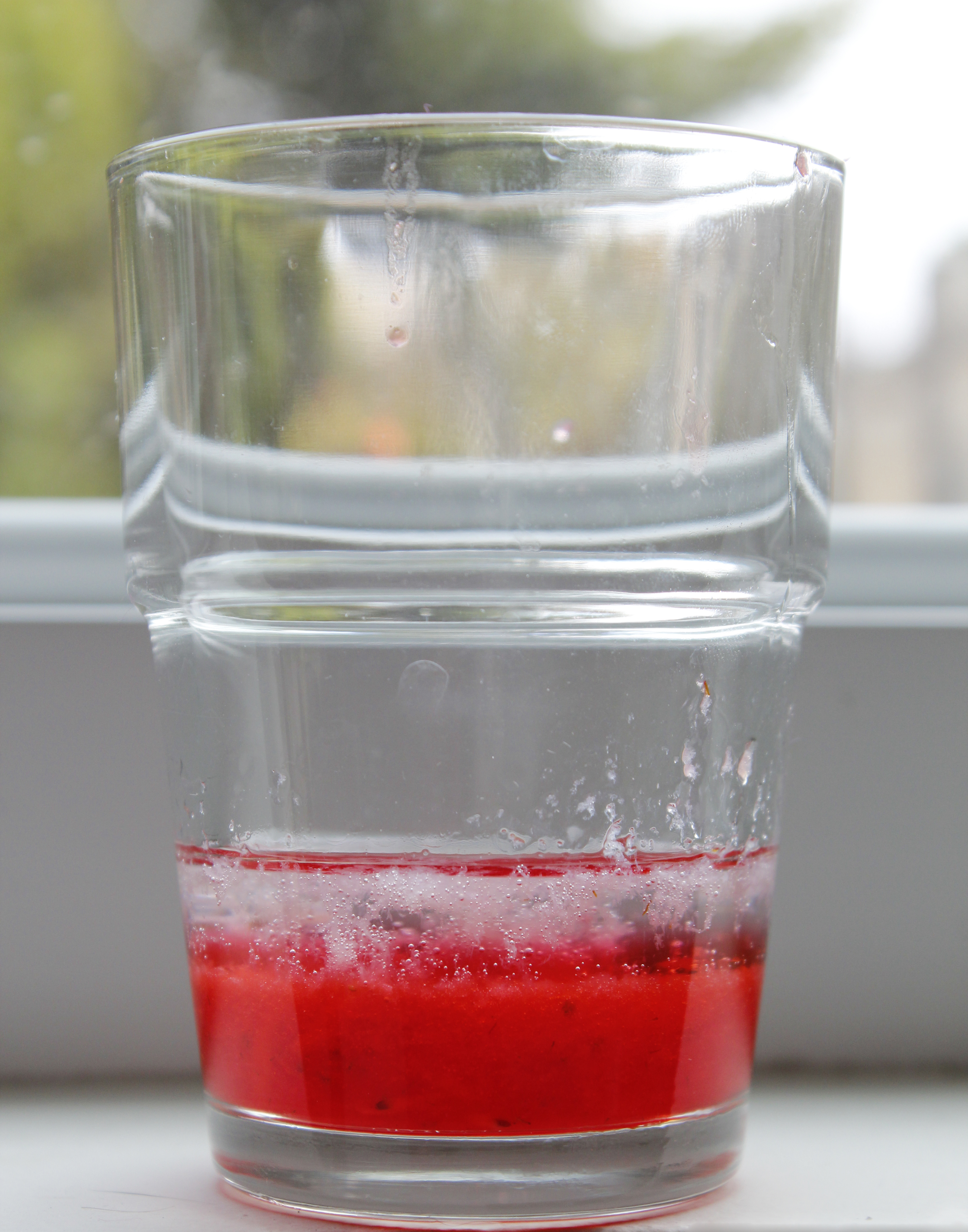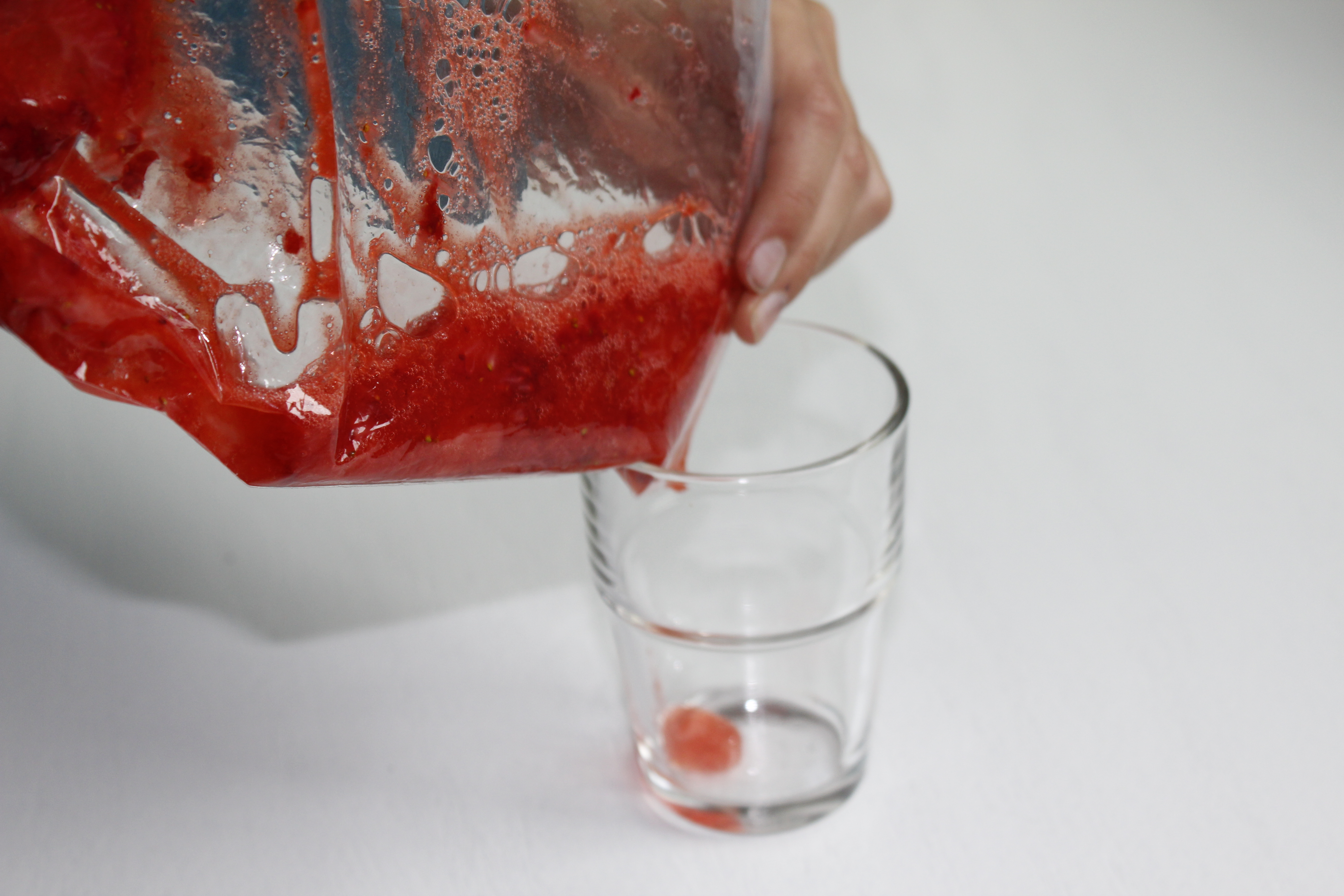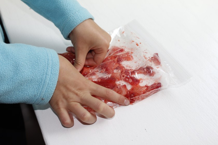 1. Put the strawberries in a ziploc bag with a teeny bit of water (a tablespoon or so). Let the air out of the bag and seal tightly. Then, squeeze the bag to crush the berries as completely as possible.