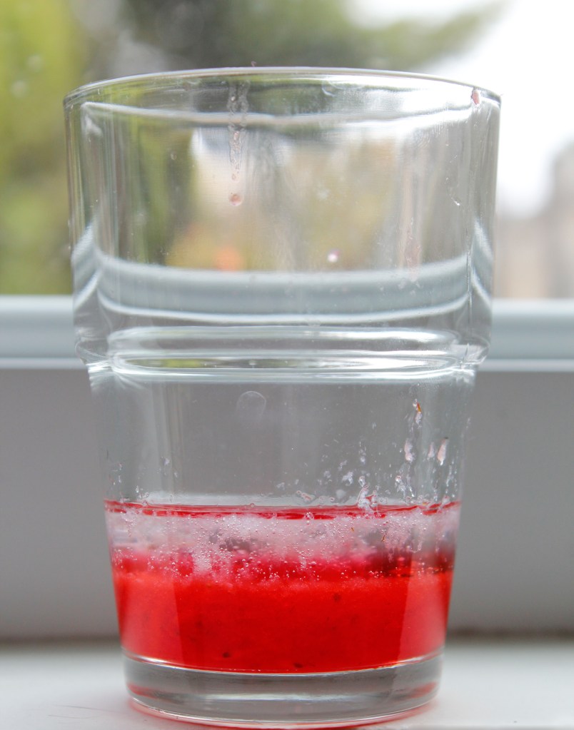 4. Now for the hardest part…very gently pour rubbing alcohol so that it rests on top of the strawberry goop and does not mix. Tip the glass a little to the side, as if you were trying to pour a carbonated beverage without getting a lot of foam. Because the DNA does not like the rubbing alcohol, it tries to pull away and clumps together. If nothing happens immediately, set the glass carefully aside and wait for a few minutes. Look again. Those white blobs and strings you see rise up into the alcohol are actually clumps of DNA! How cool is that?