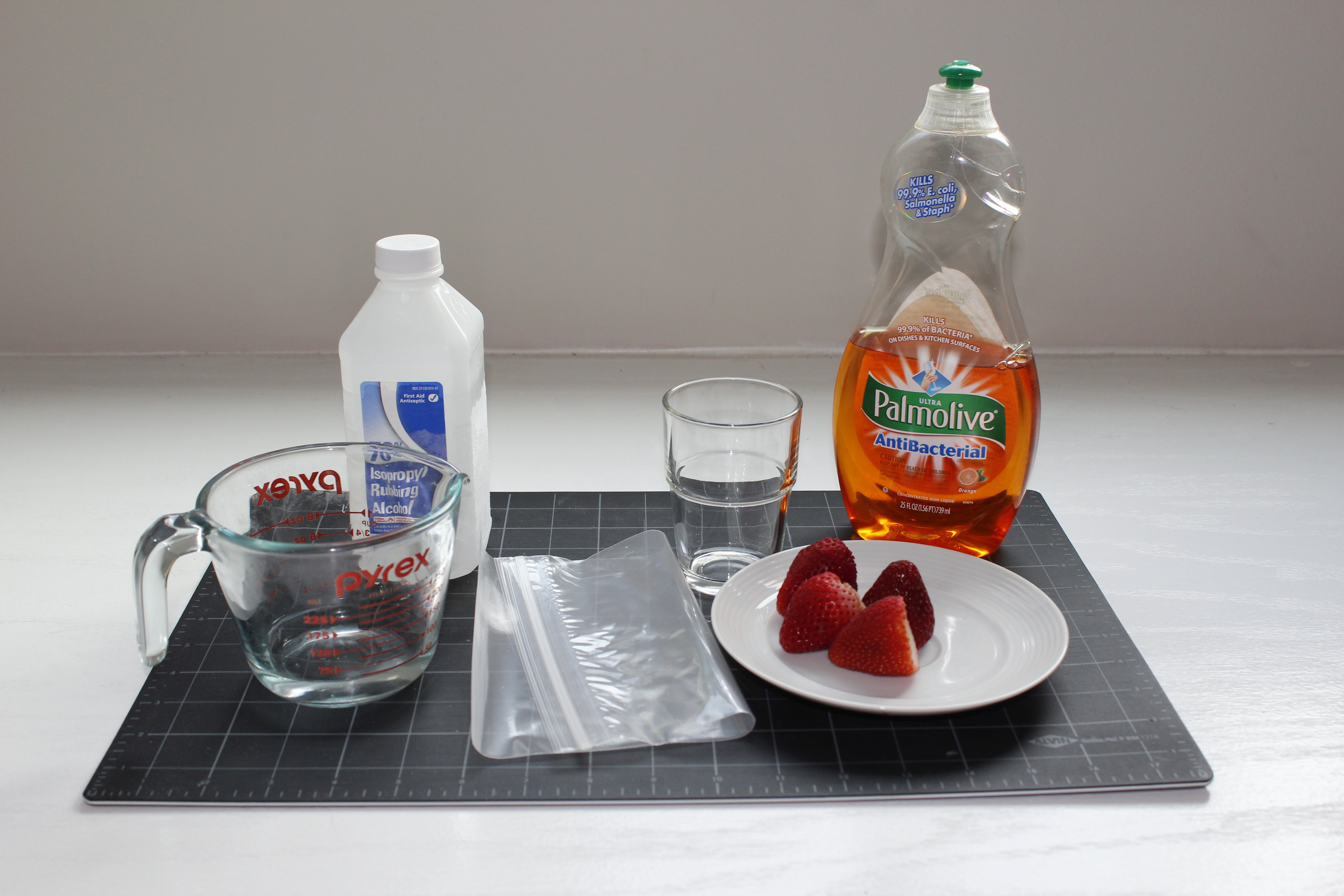 - 2 or 3 strawberries (other fruits work: bananas and kiwis are frequently mentioned as good sources for DNA extraction)