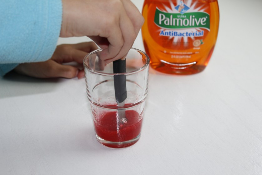 3. To break down the walls of the nuclei, add about 1/4 tsp of dishwashing liquid to the strawberry goo and stir the solution completely. It is ok if the solution gets a little frothy.