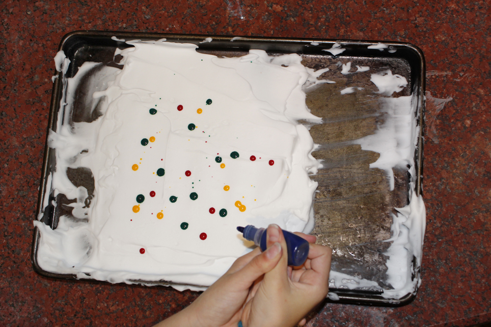 5. Dot food coloring over your shaving cream. You could sprinkle pell mell, or in a pattern.