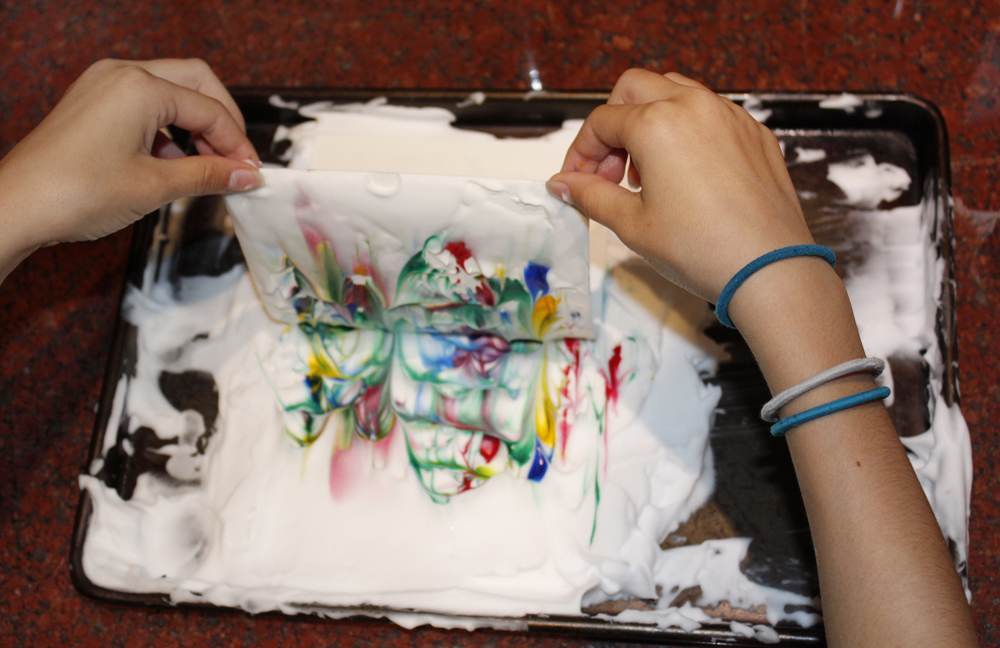 9. Use a scraper or other flat tool to gently brush the residual shaving foam from the paper, leaving the design behind.