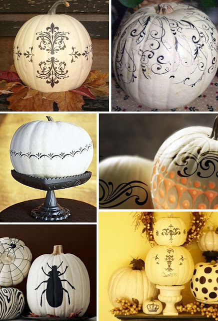 Now, for older peeps, I am wild about ink designs on white pumpkins. Haven’t found a good set of stencils, or suggestions for transferring patterns onto the pumpkins. I’m sure Martha has some ideas, but of you happen to have one or two, please share them in the comments.