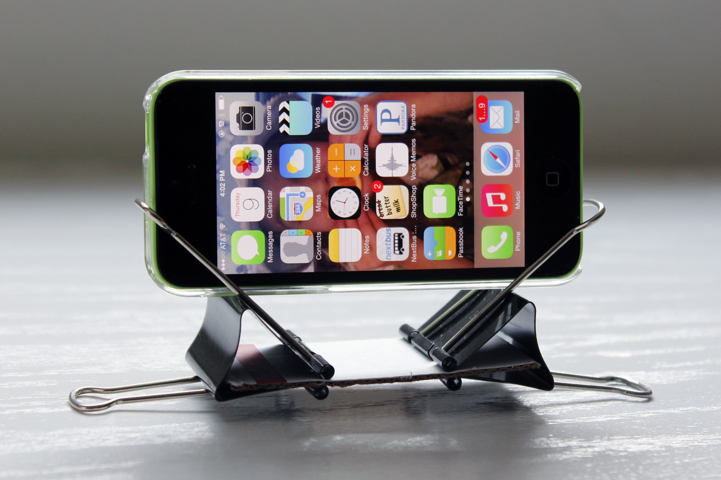 4. Macgyver a way to hold your phone up inside the box. To focus properly, the phone has to be parallel to the lens, not tilted. The easiest thing to do would be to tape the phone in place at the back of the box…but that might not be where you need to position your phone in order to focus the image on the wall. I liked the binder clip option pictured below, which also works to hold the phone vertically. Just use a narrower piece of cardboard in between the two clips.