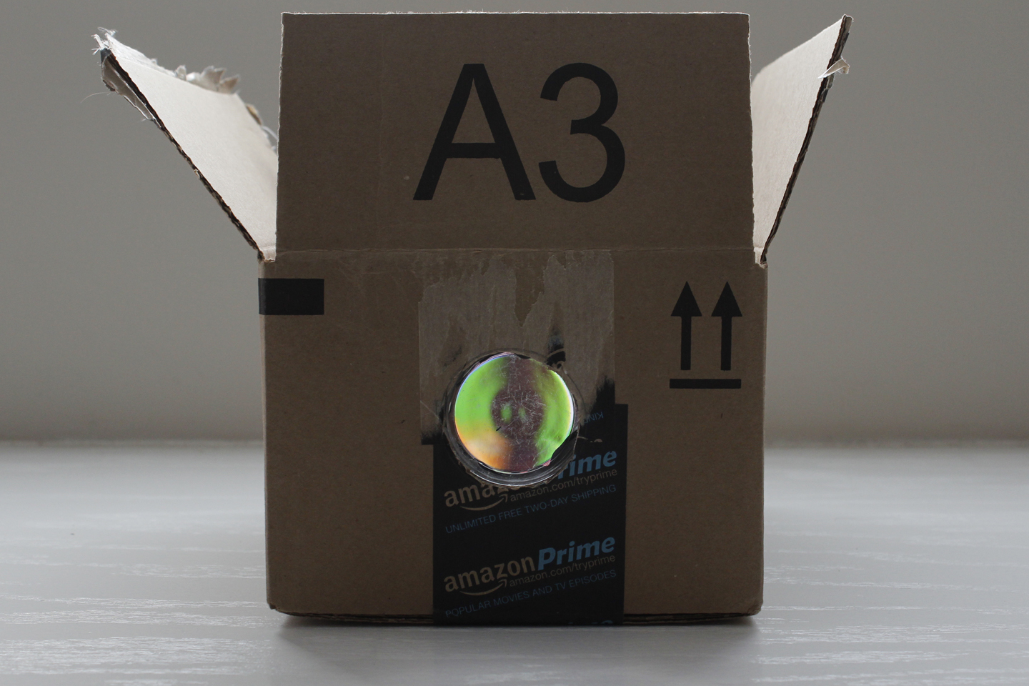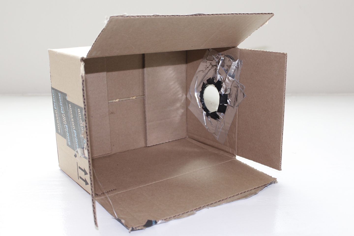Make sure to tape it well so there are no light leaks around the hole. I started to worry that the silver tape would reflect too much light and affect the image, so I switched to black tape part way through the project. Note: for ultimate viewing capability, paint the inside of the box black. Doing so will also help prevent reflection, and make for a better projected image.