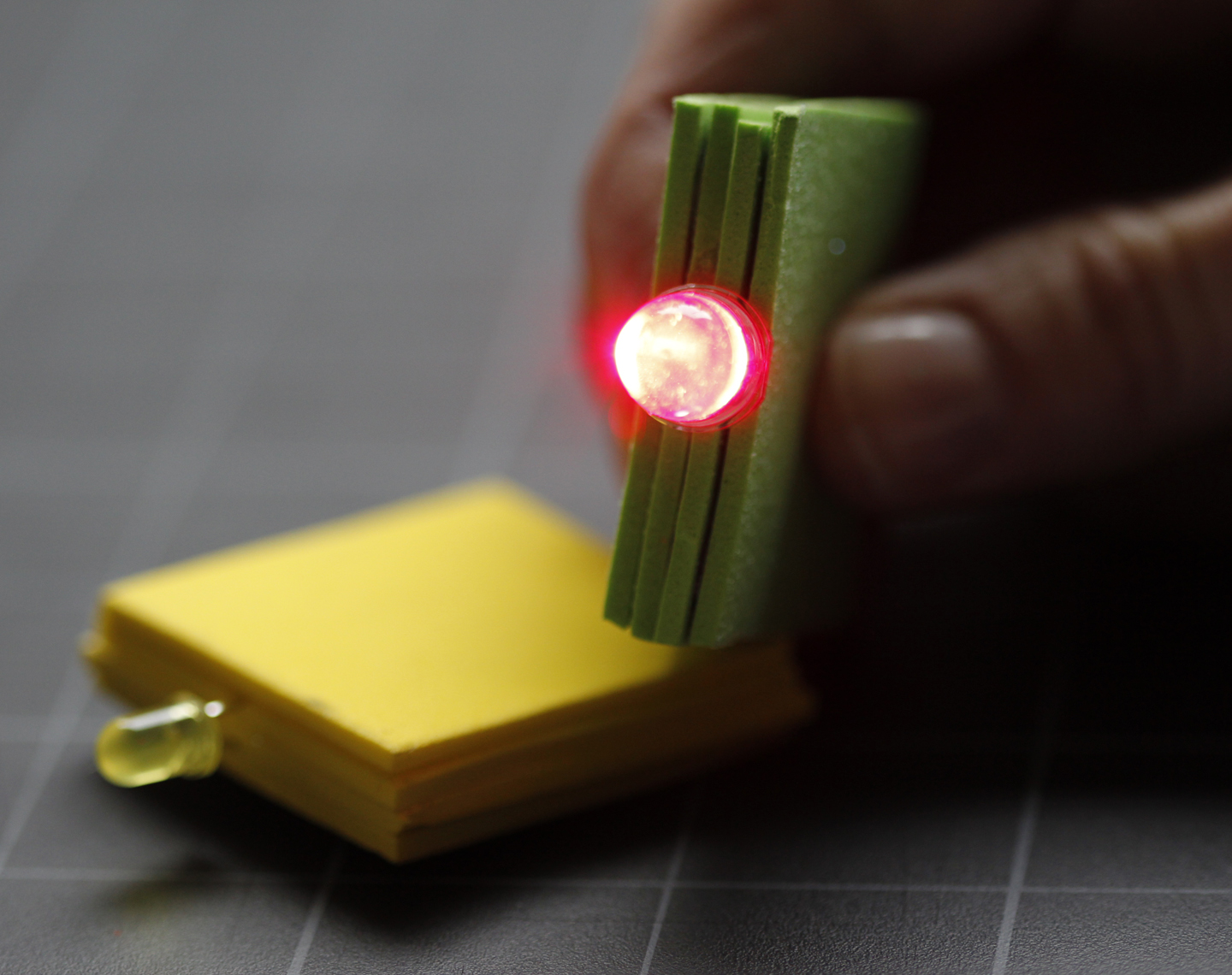 6. Peel off the backing from a circle, and place the backing over one of the LED ends. Then, peel the backing from a square and place over the circle.