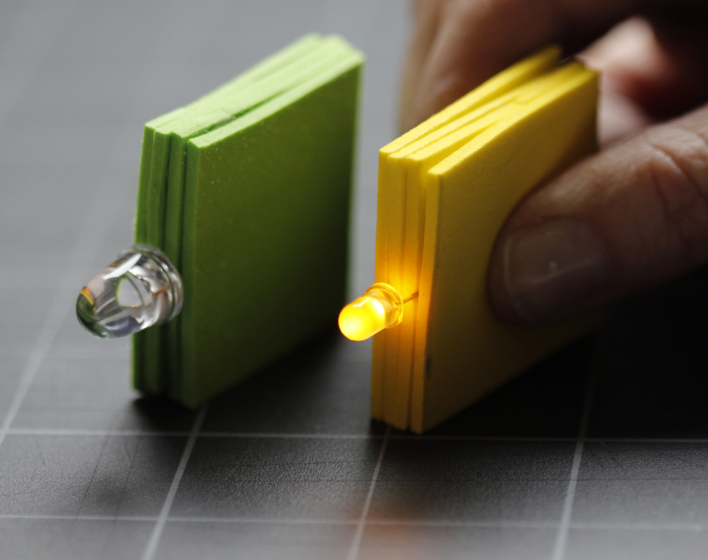 5. Slide the LED onto the battery sandwich, with the longer end of the LED paired with the positive side of the battery. Squeeze the ends to the battery to test and make sure the LED lights. Note: it’s ok to touch this thing with your bare fingers. I was very, very nervous to do so, but lived to tell.