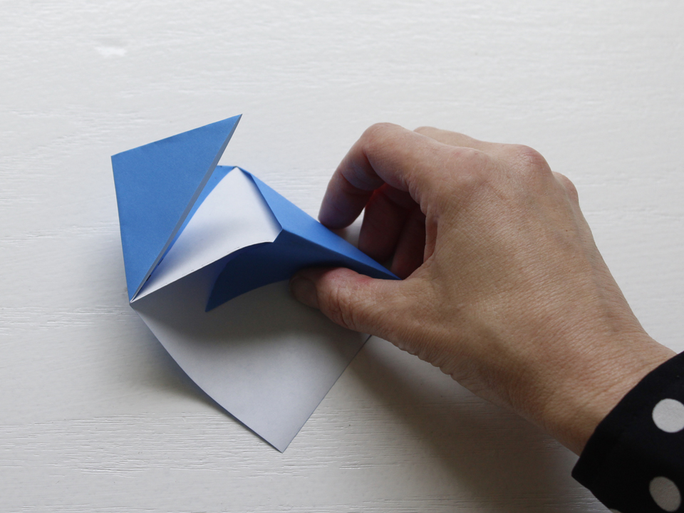 4. Fold one of the bottom points–the top “nose”–to meet at the center of the top fold. Leave the other nose flat beneath it.
