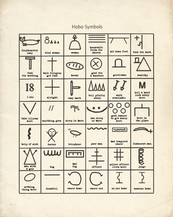 Go home and draw your map out on big paper. Depression-era itinerant workers and “hobos” used to chalk signs outside houses to let each other know where to find food and shelter and to pass on other useful information. Adopt some of these symbols for your map, or create your own.