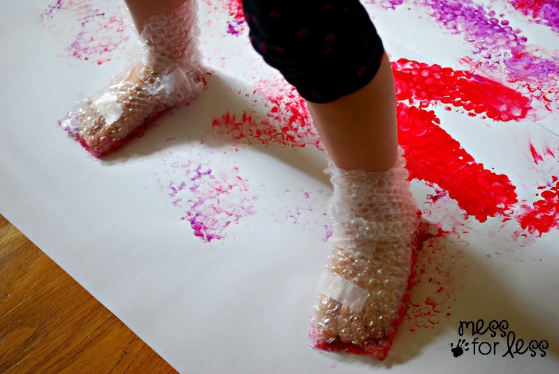 Everyone likes popping bubble wrap. Everyone likes making noise. Everyone loves activities that seem just a little bit not-allowed – like Bubble Wrap Stomp Painting, an activity I have lifted from the nifty messforless.net, and that’s been making some serious internet rounds. Wrap your kiddo’s feet in bubble wrap, lay down some paper, add some paint, and … voila.