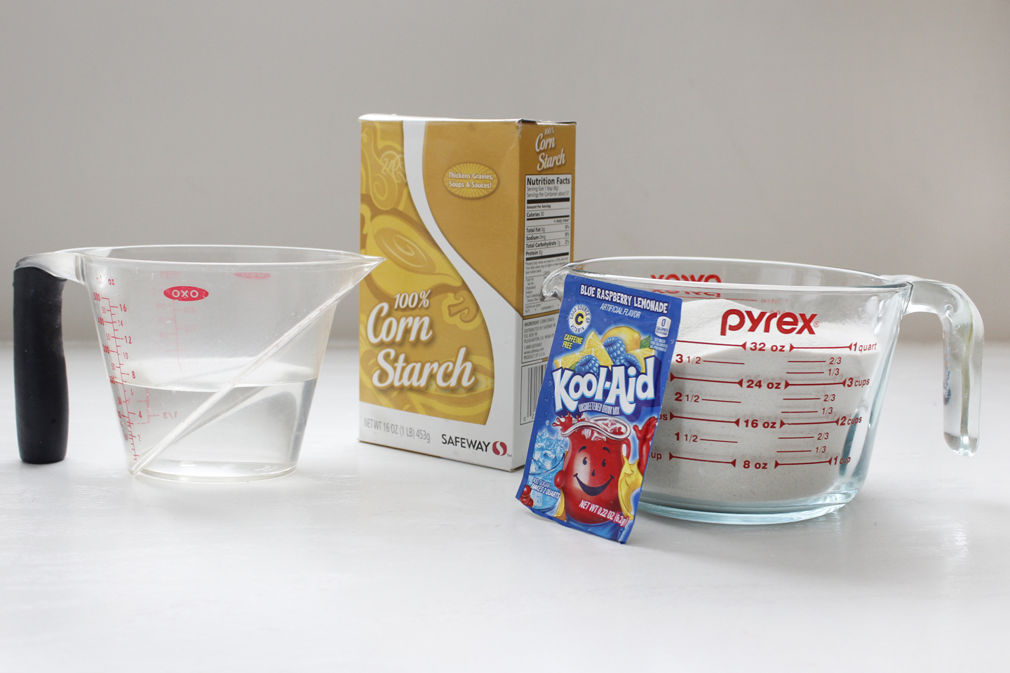 4 cups play sand. I wasn’t so worried about my kids eating this, and since it is moist I wasn’t worried about inhaling the dust, so I used plain old sand. If your kid eats everything, you may wish to look for a silica-free variety.- 2 cups corn starch