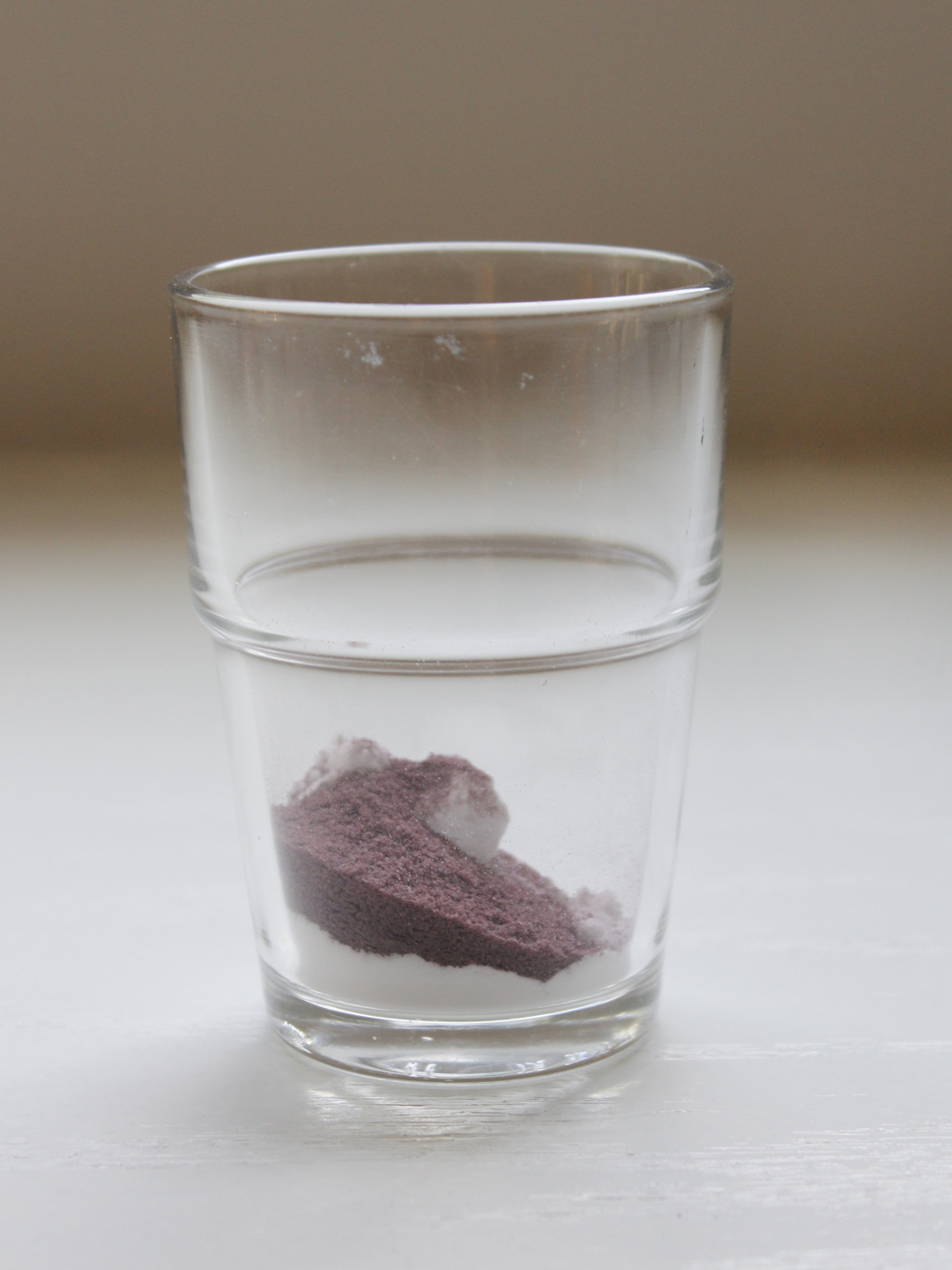1. Combine a heaping tablespoon of baking soda and one packet of unsweetened Kool-Aid. Mix these dry ingredients thoroughly and put them into whatever needs to erupt. I’m just using a boring glass since we don’t have any spare volcano models lying around at the moment.
