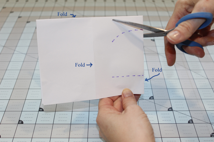 6. Make two cuts from the center fold: a slight curve for the top of the stage, and a straight one for the floor of it. Do NOT cut all of the way to the middle fold.